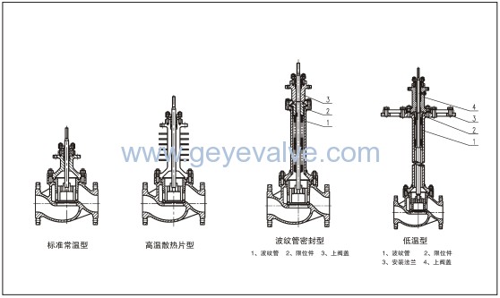 | 系列類型 | 常溫型、中溫型、低溫型。波紋管密封型、夾套保溫型、調節切斷型 | ||||||||||||||||||||||||||||
